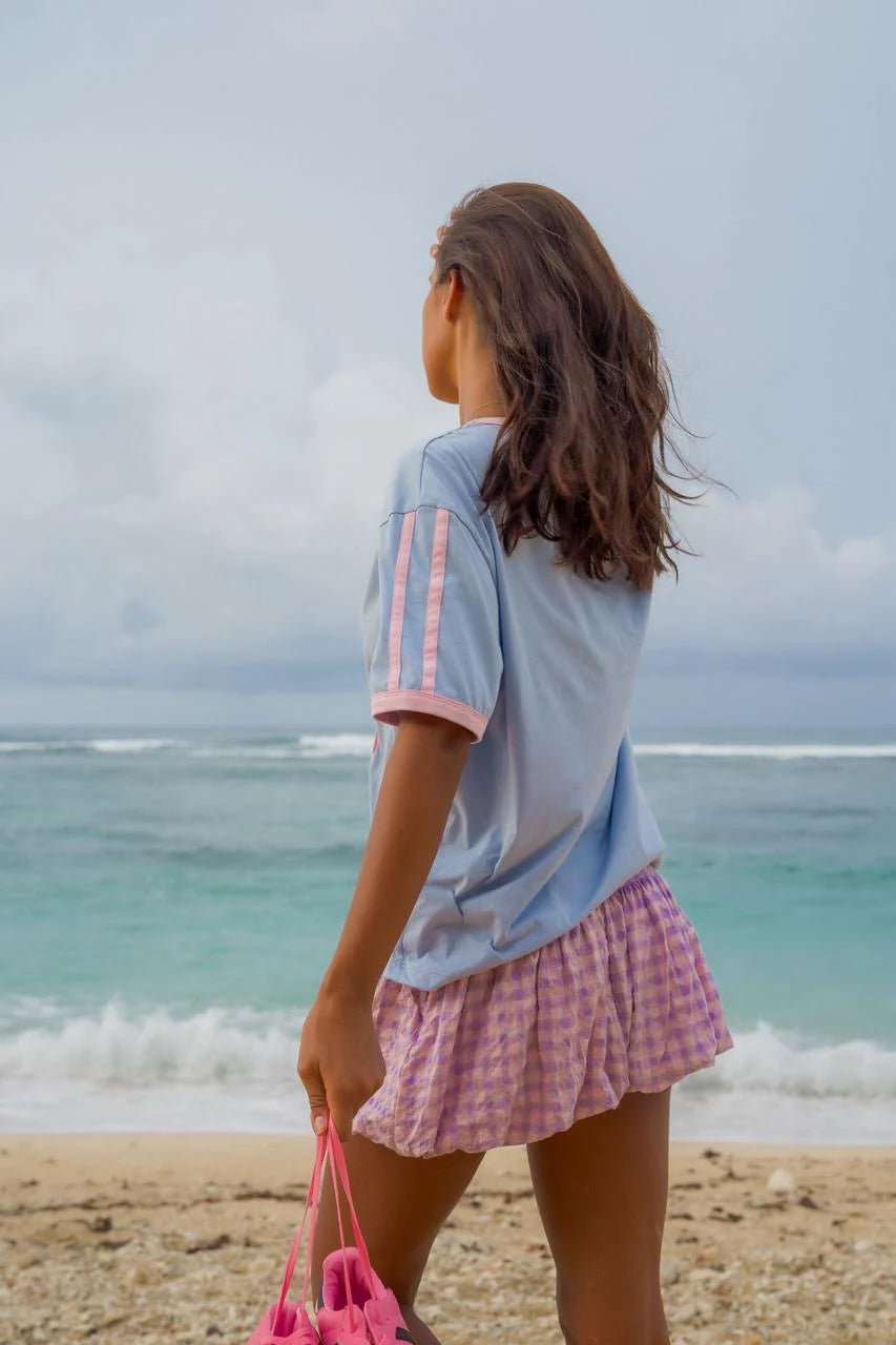 100% Combed Cotton in powder blue with stripe detail on sleeve