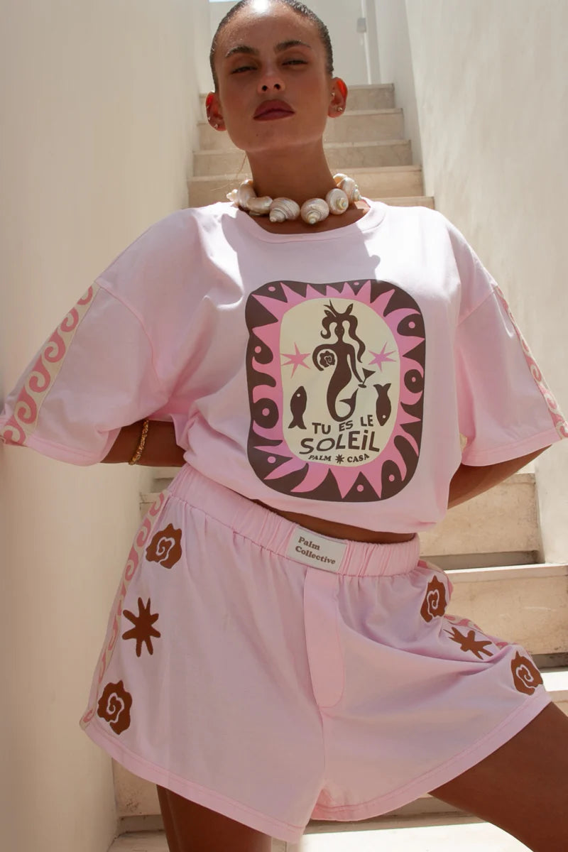 These new Sol shorts are made from a cotton knit jersey fabric in a low waist style that features an elastic waistband with logo, and fake fly. The shorts are a relaxed style, with embroidered detail down front and a wave cotton trim on the sides. Style it with our matching Soleil T-shirt to create the perfect comfy set. Exclusively by Palm Collective.